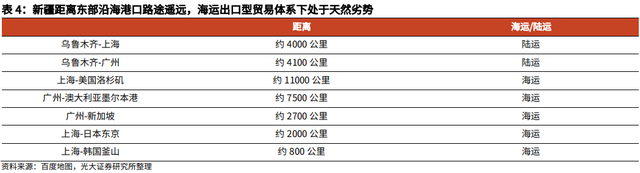 新疆地处大西北,与东部沿海经济发达地区相距较远,陆运运输成本高,在过往以“海运”为主导的出口型贸易体系下有天然劣势;受制于运输成本,部分产品供给只能在新疆当地消化,难以供应内地市场。