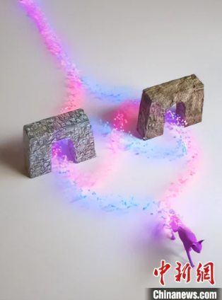 量子不确定因果序的示意图。蓝色和红色路线经过两个门的时序不同且处于量子叠加态。 中国科大供图