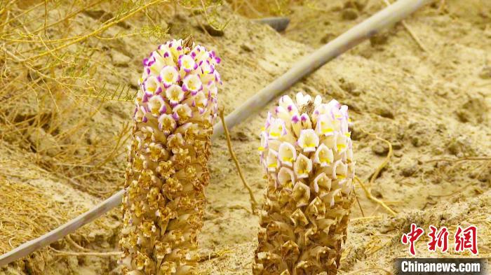 连日来,新疆巴州且末县防风治沙工作站的工作人员正忙着查看大芸花的授粉情况。大芸也叫肉苁蓉,被人们称为“沙漠人参”,是一种药用价值极高的中药材,大芸属于寄生植物,每3—5年种植一次,每年可以采收果实2次,采收种子1次,大芸花开玲珑秀气似宝塔,是沙漠中一道独特的风景。