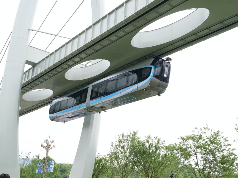 空轨即“悬挂式单轨”,是一种中低运量、生态环保、绿色低碳的城市交通新制式。其列车悬挂在单型轨道下方,将地面交通移至空中,具有占地少、造价低、转弯半径小等特点。
