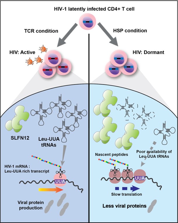 新发表的论文确定并表征了SLFN 12蛋白,SLFN 12通过切割特定细胞tRNAs来限制病毒蛋白质的产生,tRNAs是蛋白质构建的基石。因此,在存在活性SLFN 12的情况下,感染HIV的CD4 T细胞无法完成病毒的产生过程,而是将其模板HIV RNA保持在潜伏状态。