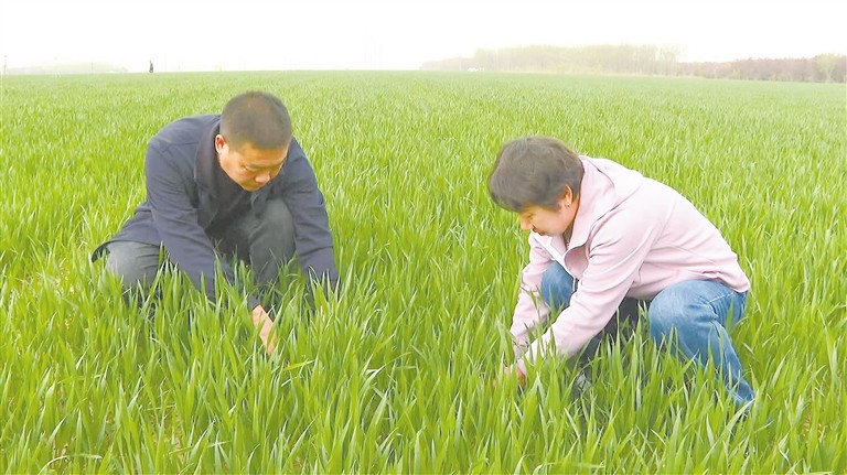 农技专家查看小麦苗情长势、土壤墒情,指导农户精准化灌溉。