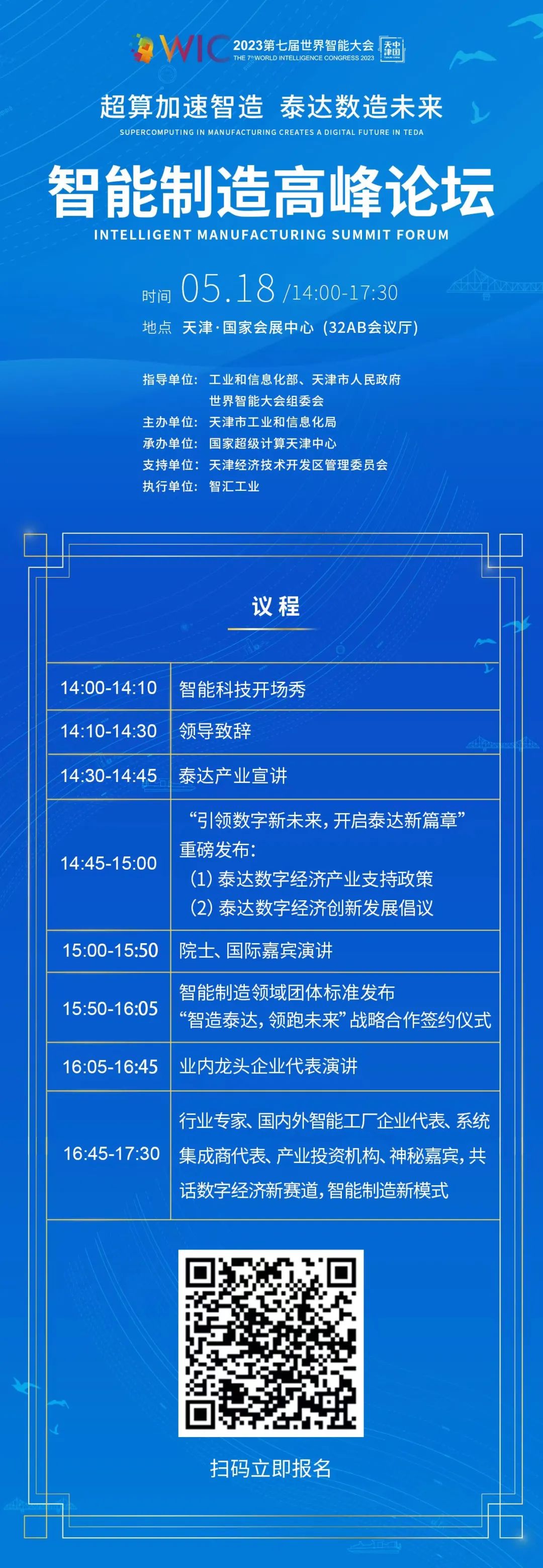 备受瞩目的第七届世界智能大会将于5月18—21日在天津隆重举办。5月18日14:00,天津经开区将在国家会展中心(天津)32AB会议厅支持举办重要平行论坛——智能制造高峰论坛。本次论坛主题是“超算加速智造,泰达数造未来”。论坛由工业和信息化部、天津市人民政府指导,天津市工业和信息化局主办,国家超级计算天津中心承办,智汇万联(北京)信息技术有限公司执行。