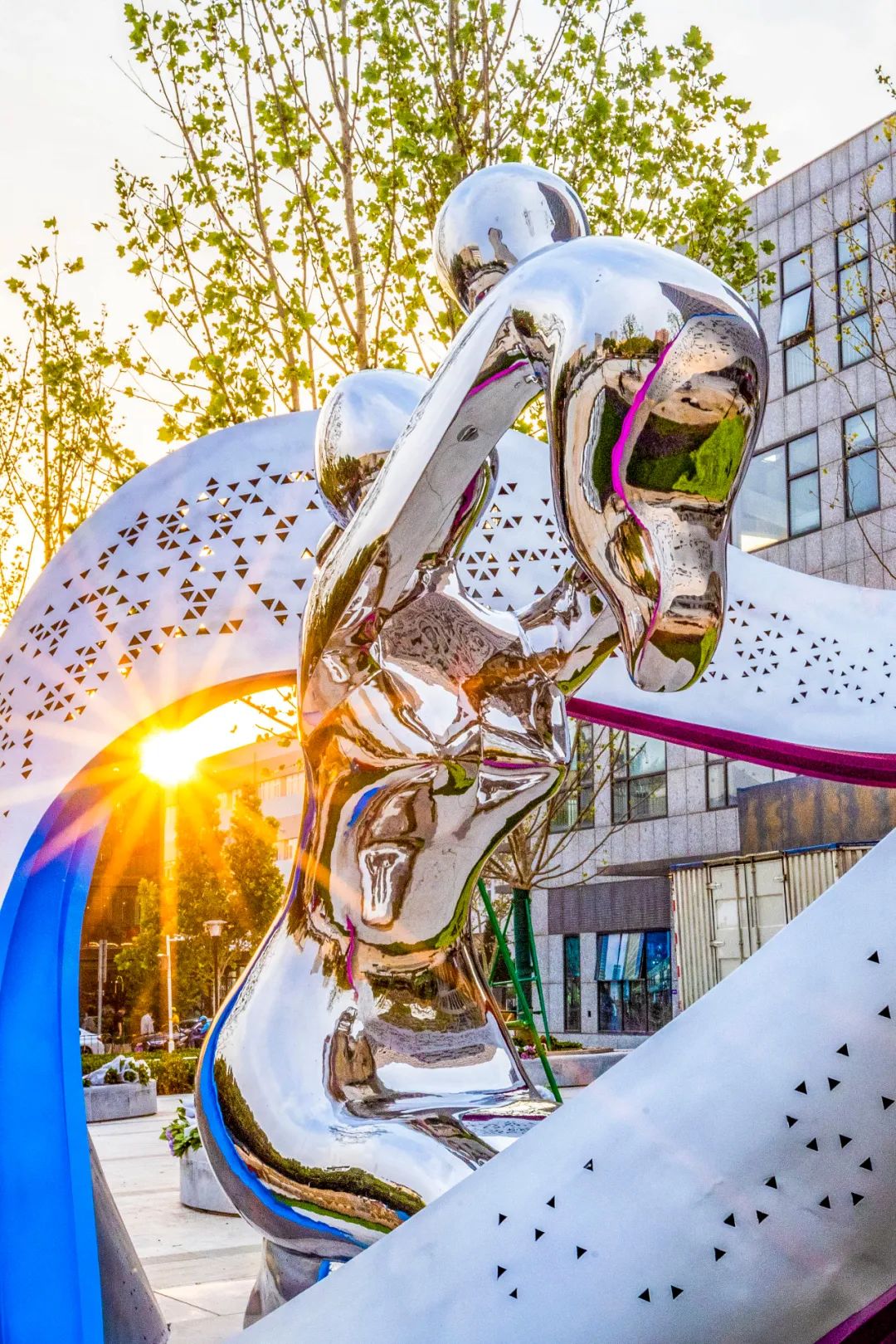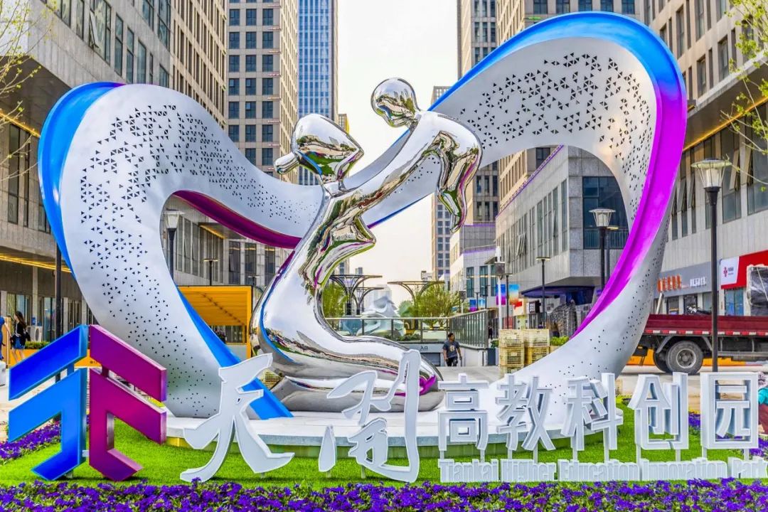 5月14日,天开高教科创园主雕塑在核心先导区──天津科技广场南广场树立完成,莫比乌斯环围合“母育子”的形象寓意“天开”的未来拥有无限可能。