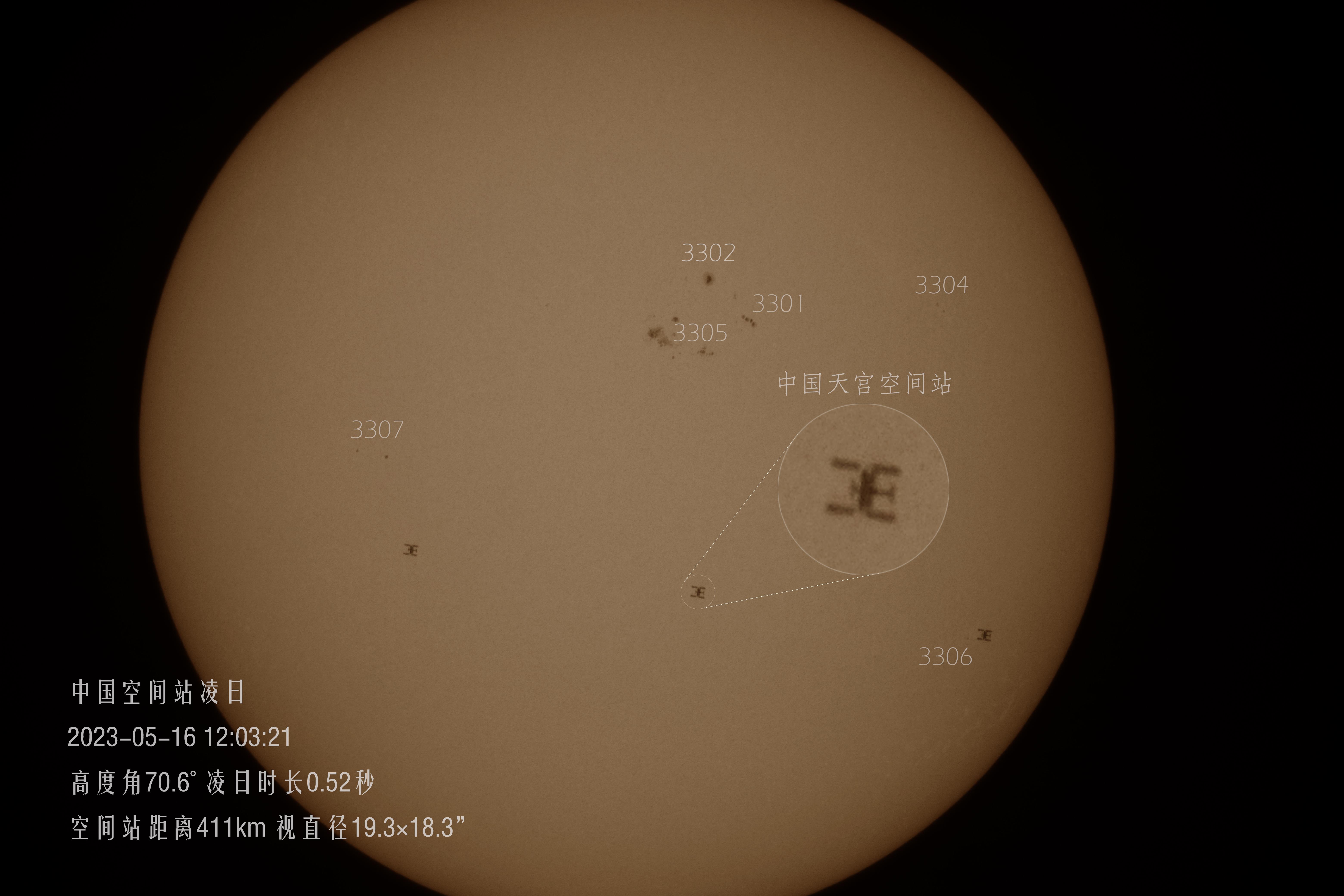 2023年5月16日12时03分21秒,山西省物理学会天文工作委员会成员在山西省太原市晋阳湖畔完成了此次中国空间站凌日现象的拍摄。空间站经过日面时长0.52秒。从凌日时空间站剪影可以清晰分辨中国天宫空间站的三舱两船构型(天和核心舱、问天实验舱、梦天实验舱、神舟十五号、天舟六号),五对太阳翼剪影清晰可见。