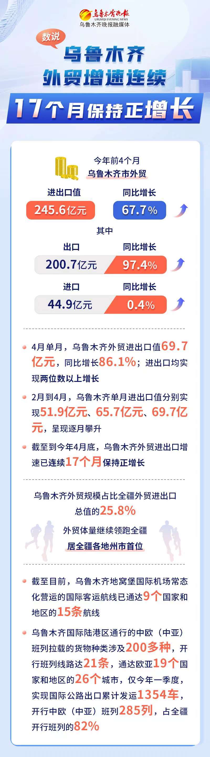 今年前4个月,乌鲁木齐外贸进出口值继续居全疆各地州市首位。截至4月底,乌鲁木齐外贸增速已连续17个月保持正增长。