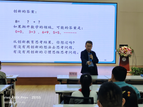 陈教授从为什么要开展创新发明教育、怎样认识创新、学会思维、学会创新、学会发明三个角度给师生、家长们进行了系统而有趣的解读,同学们认真倾听,增强了对创新的理解,意识到思维定势对创新思维的限制。