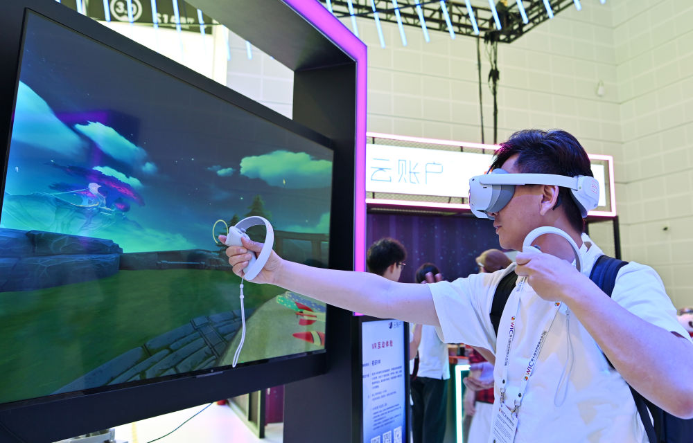 5月18日,在第七届世界智能大会智能科技展上,与会者在云账户展台进行VR互动体验。新华社记者李然摄