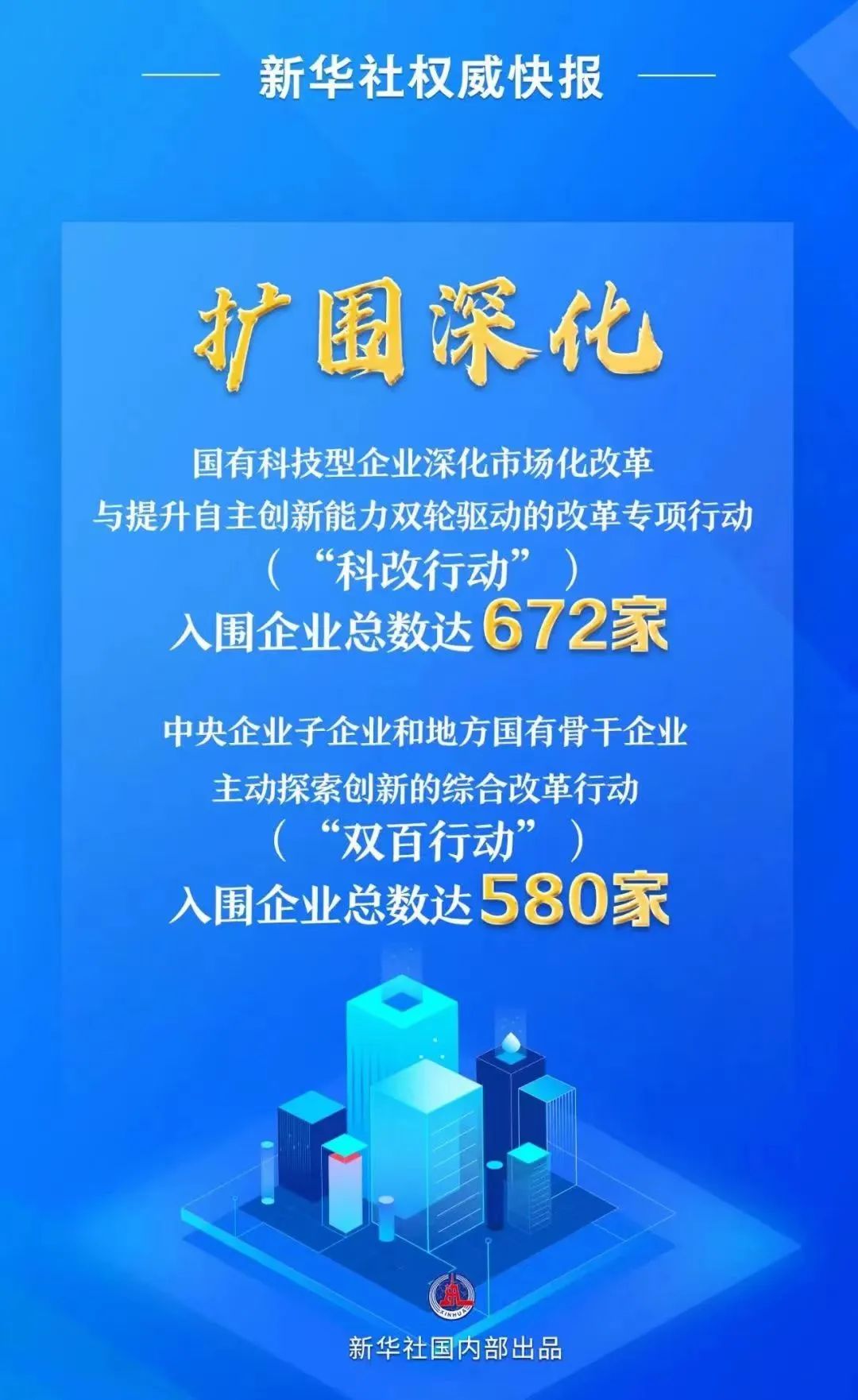 2018年8月,国企改革“双百行动”启动,选取百余户中央企业子企业和百余户地方国有骨干企业,创新推进综合改革,打造“改革尖兵”。2020年,“科改行动”实施,支持和引导国有科技型企业在市场化改革和提升自主创新能力上取得新突破。两项行动实施以来,“双百企业”和“科改企业”在科技创新、市场化改革、经营效益等方面充分发挥出示范突破带动作用,凝聚起全面深化国有企业改革的强大力量,形成全面铺开的国企改革崭新局面和良好态势。