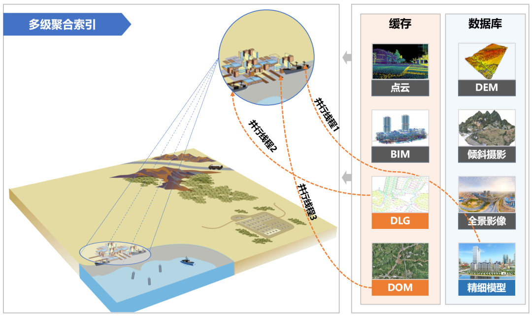 采用双索引动态分页、精/简模型自动构建LOD、数据分类并发调度以及硬件资源优化配置等方式实现海量城市多维时空信息数据快速调度渲染。