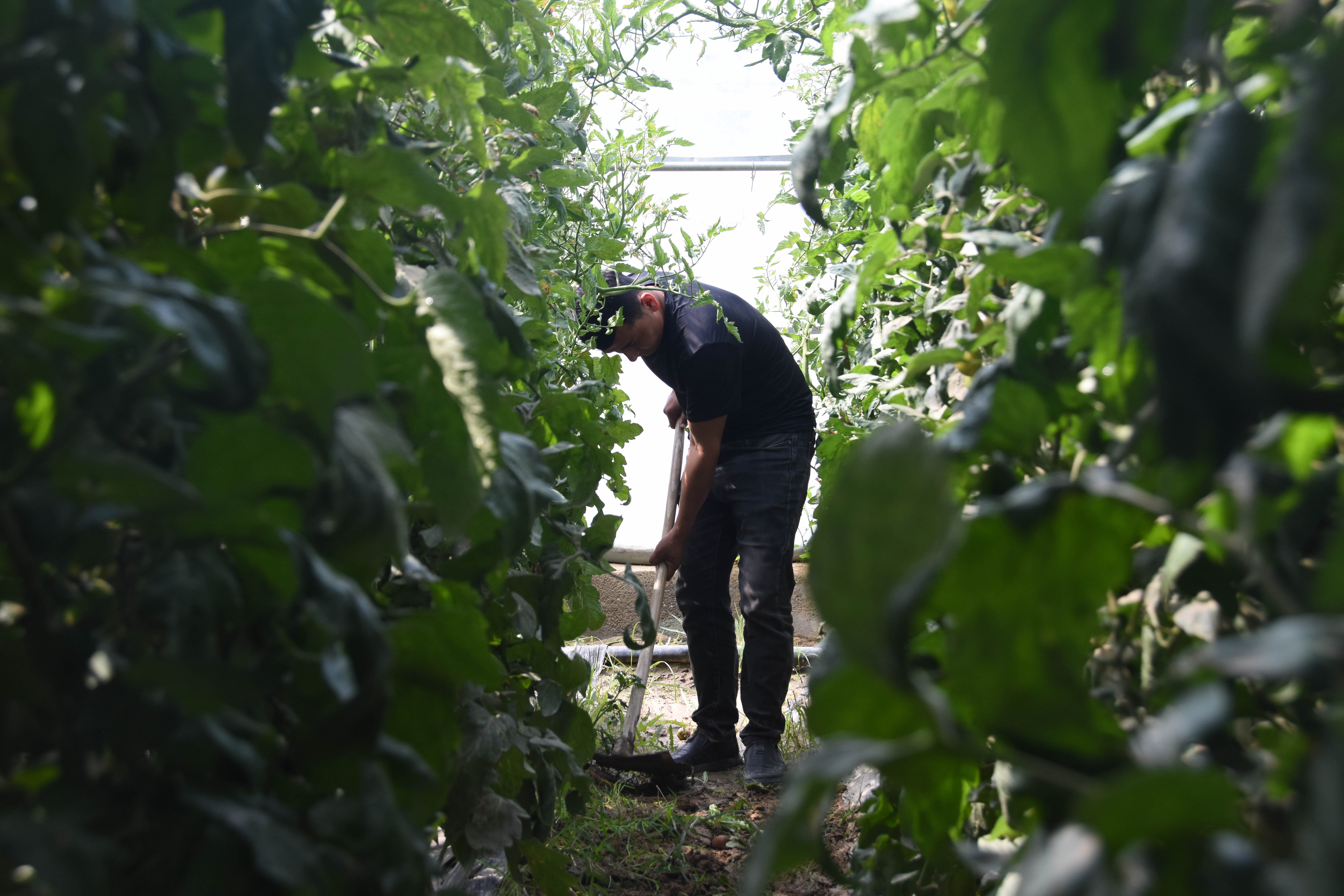 5月18日,津南新村村民塔依尔江·买提努尔正在蔬菜大棚作业。新华社记者杜刚 摄