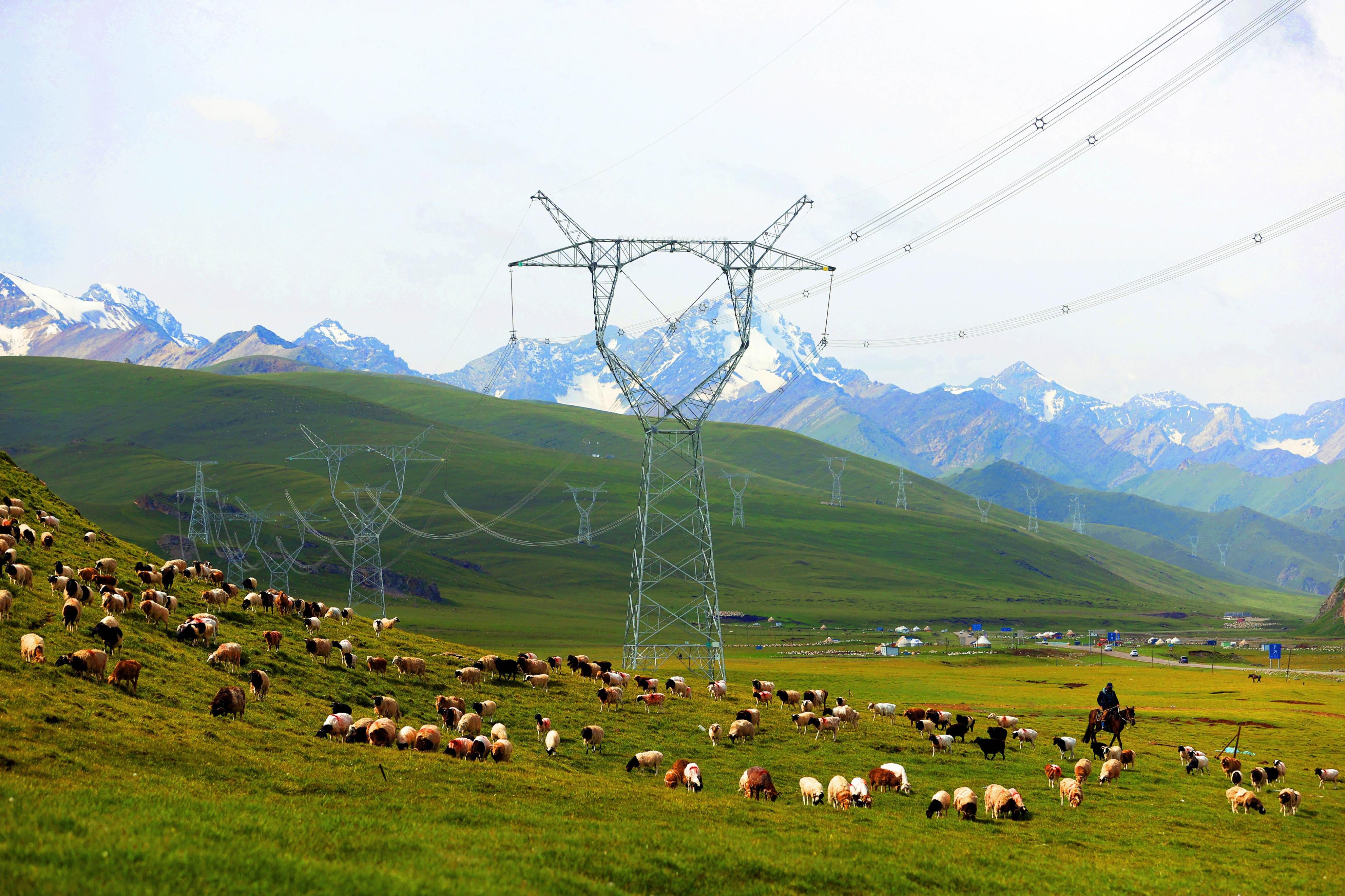 ▲750千伏输电线路横穿南疆巴音布鲁克草原,生态和谐。