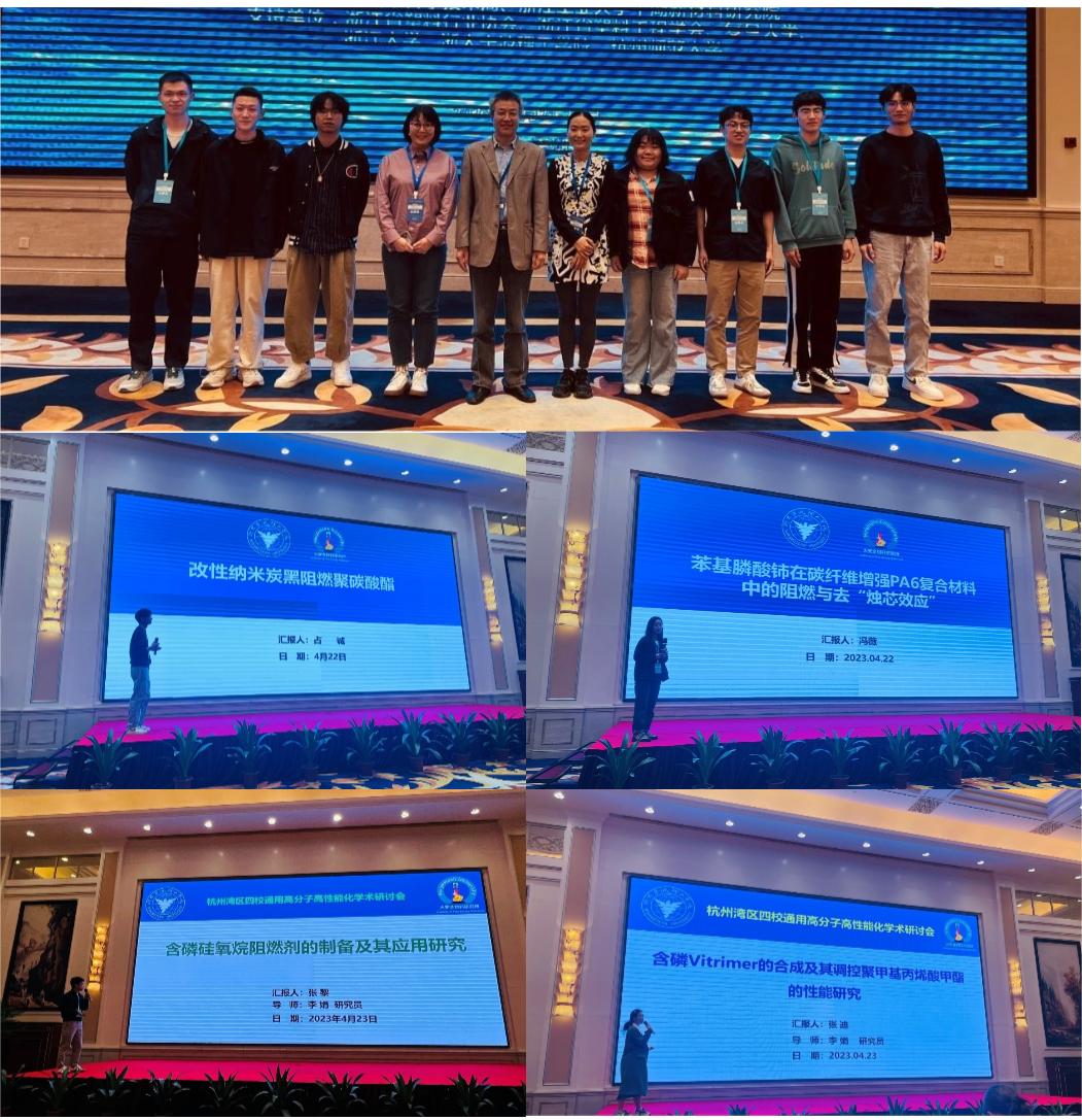 会议围绕高分子的功能化与高性能化改性(增强增韧、增容、导热、阻燃、屏蔽等)、高分子功能助剂(成核剂、稳定剂、阻燃剂)、生物可降解高分子材料、智能凝胶材料、能源环境材料等方向的前沿研究展开交流。研讨会期间,我校团队与杭州湾其他三校专家和研究生、与嘉兴平湖新材料相关企业在通用高分子高性能化领域交流了行业前沿技术,分享了最新研究成果;来自我校火安全材料团队的冯薇、占诚、张黎、张迪四位研究生分别作了《苯基膦酸铈在碳纤维增强PA6复合材料中的阻燃与去“烛芯效应”》《改性纳米炭黑阻燃聚碳酸酯》《含磷硅氧烷阻燃剂的制备及其应用研究》《含磷Vitrimer的合成及其调控聚甲基丙烯酸甲酯的性能研究》的精彩学术报告。