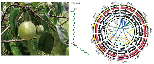 在此项研究中,研究人员攻克了该植物由于植株各部位含油量高而无法进行有效染色体交联的瓶颈,首次获得了高通量测序数据。基于前期蒜头果基因组草图,进一步优化了基因组组装策略,最终获得了染色体级别的高质量基因组,大小为1.5G。同时,研究人员在蒜头果基因组中鉴别了26个与神经酸合成相关的基因。结合种子转录组,分析其种子初始发育期神经酸开始合成,以及中后期神经酸大量合成和累积过程,发现6个神经酸合成候选基因在种子中高表达,且大部分已经证明参与神经酸的生物合成。