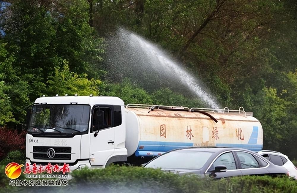 在河滩快速路上,园林绿化作业车辆正在进行绿植养护。记者石磊摄