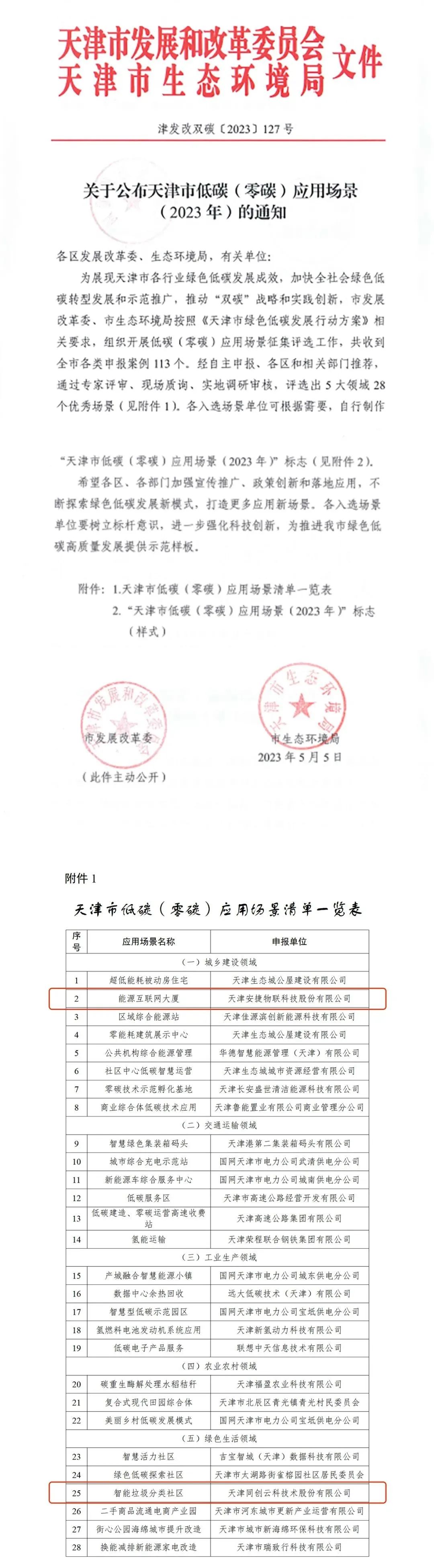 近日,由市发改委和市生态环境局依据《天津市绿色低碳发展行动方案》联合组织,成功完成了全市低碳(零碳)应用场景征集评选工作。高新区经发局推荐的天津安捷物联科技股份有限公司参选的能源互联网大厦项目和天津同创云科技术股份有限公司参选的智能垃圾分类社区项目经专家评审与实地审核,在全市113个申报案例中脱颖而出,成功被评选为天津市低碳(零碳)优秀应用场景。