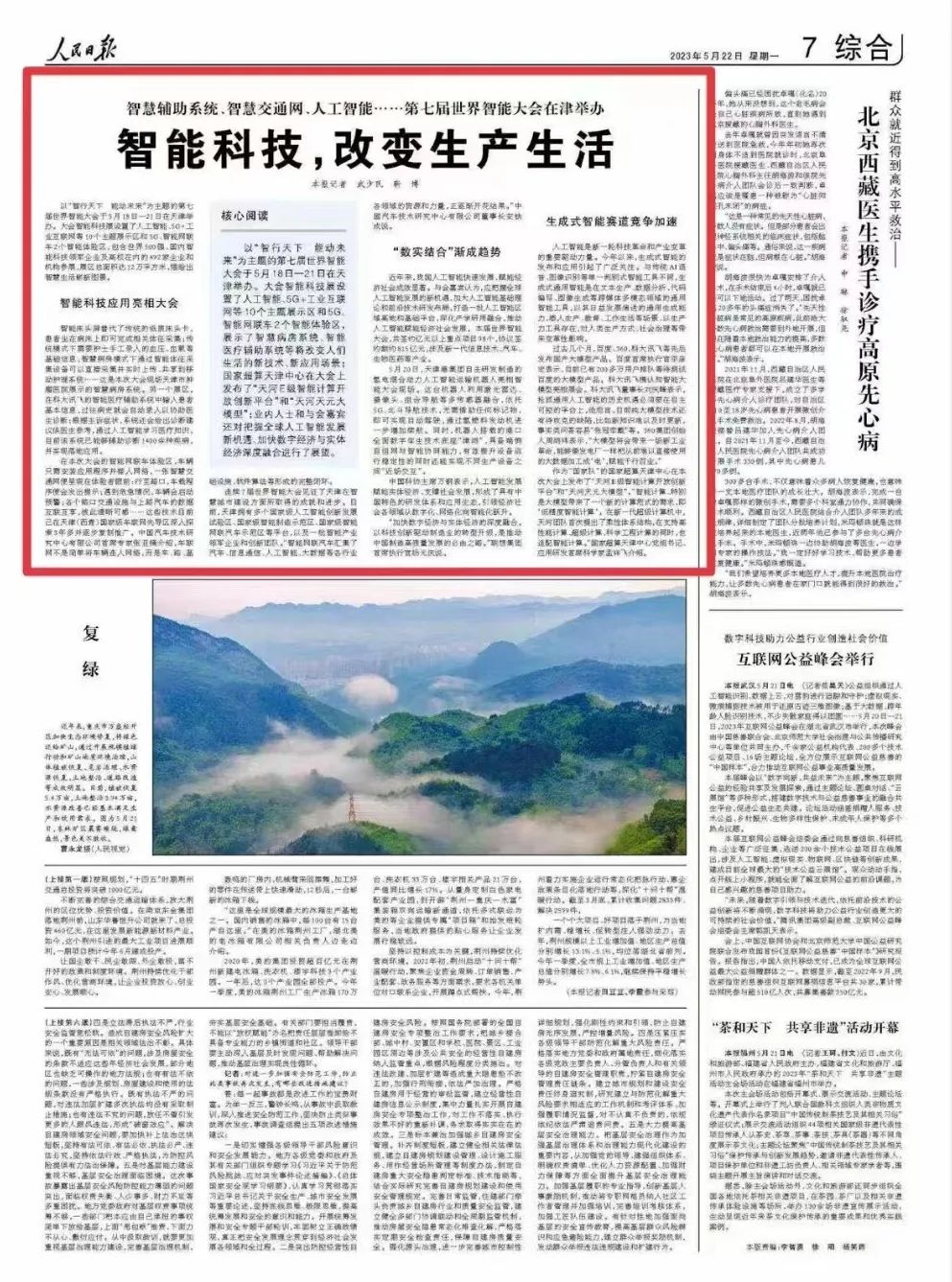 5月22日,《人民日报》刊发《智能科技,改变生产生活》。以“智行天下 能动未来”为主题的第七届世界智能大会于5月18日—21日在天津举办。大会智能科技展设置了人工智能、5G+工业互联网等10个主题展示区和5G、智能网联车2个智能体验区,展示了智慧病房系统、智能医疗辅助系统等将改变人们生活的新技术、新应用场景;国家超算天津中心在大会上发布了“天河E级智能计算开放创新平台”和“天河天元大模型”;业内人士和与会嘉宾还对把握全球人工智能发展新机遇、加快数字经济与实体经济深度融合进行了展望。