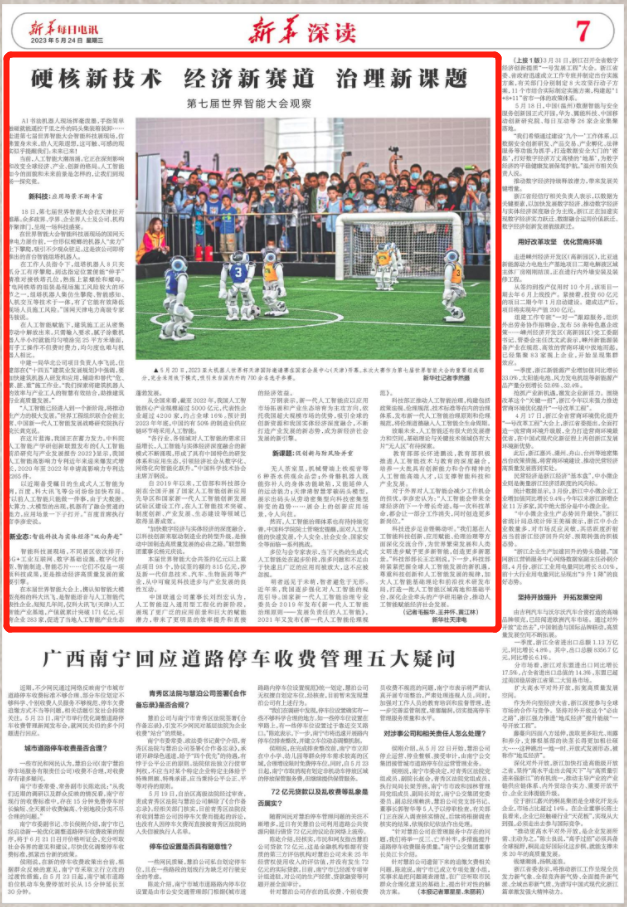 5月24日,《新华每日电讯》刊发《硬核新技术 经济新赛道 治理新课题:第七届世界智能大会观察》。AI书法机器人现场挥毫泼墨,手指简单触碰就能遥控千里之外的码头集装箱装卸……走进第七届世界智能大会智能科技展现场,仿佛置身未来,给人无限遐想,这可触、可感的现实似乎提醒我们:未来已来!
