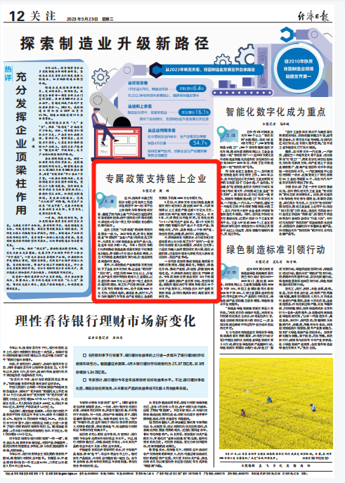 5月23日,《经济日报》刊发《探索制造业升级新路径——天津:专属政策支持链上企业》。天津一系列旨在加快推动制造业高质量发展的政策措施,锚定高端化、智能化、绿色化方向,推动产业链、供应链、价值链向高端迈进。