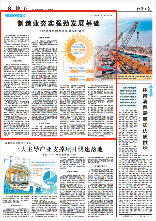 5月24日,《经济日报》刊发《制造业夯实强劲发展基础——天津持续巩固经济恢复向好势头》。今年以来,天津各级部门扎实推进“十项行动”,全力拼经济、聚力抓发展,落实落细“稳经济运行33条”等各项政策,持续巩固经济恢复向好势头。
