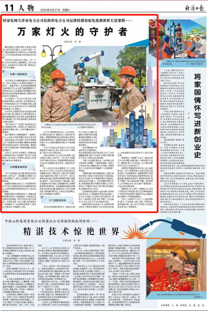 5月27日,《经济日报》刊发《国家电网天津市电力公司滨海供电分公司运维检修部配电抢修班班长张黎明——万家灯火的守护者》。谦和的微笑,忙碌的身影,扎根电力抢修一线,坚守在服务群众、企业的“最后一公里”,他就是国家电网天津市电力公司滨海供电分公司运维检修部配电抢修班班长张黎明。30多年来,他坚守初心使命,一步一个脚印,在平凡的岗位上默默耕耘。因工作成绩突出,先后被评为“改革先锋”“最美奋斗者”和“时代楷模”。