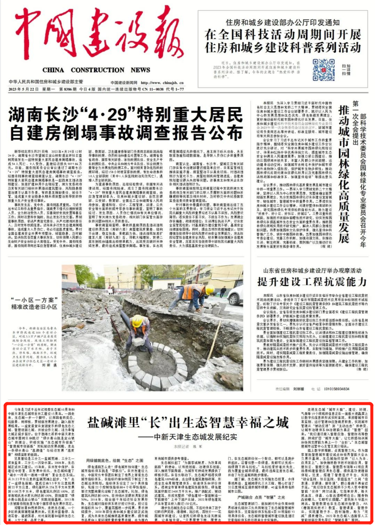 5月22日,《中国建设报》刊发《盐碱滩里“长”出生态智慧幸福之城》。今年是习近平总书记视察生态城10周年和中新天津生态城项目开工建设15周年。一路走来,生态城一步一个脚印,以探路者的姿态,绘新景、树样板,贯彻新发展理念,融入新发展格局。一座宜居宜业宜游宜乐的绿色生态之城、智慧创新之城、开放合作之城、活力幸福之城正阔步前行。