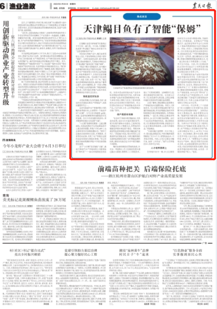 5月25日,《农民日报》刊发《天津鳎目鱼有了智能“保姆”》。红烧鳎目鱼是天津家庭节庆餐桌必不可少的一道大菜。不久前,天津鳎目鱼成果“津沽鳎目”被农业农村部评为“全国名特新优农产品”。但在海水养殖产业中,鳎目鱼常因贴边、沉底、不爱动等特性让养殖户直呼“难搞”。为更好地培优品种、提升养殖质量、提高养殖技术,天津海水养殖企业为“津沽鳎目”量身定制了智能“保姆”。