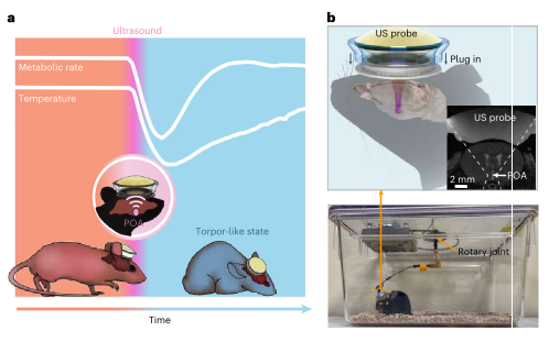 美国圣路易斯华盛顿大学陈红及其同事此次开发了一个超声发射器,可安装在自由活动的小鼠头部。他们针对下丘脑视前区施加了10秒超声脉冲,已知这一脑区可调节冬眠活动。这一活动在雌鼠和雄鼠中激发了即时体温下降数度(平均3-3.5℃),同时伴有心率下降和氧消耗下降,两小时内这些动物就完全恢复了。团队随后结合超声发射器和一个自动系统,会在体温开始上升时发射重复超声脉冲,从而将实验动物的这一类蛰眠状态维持高达24小时,且没有伤害或不适的迹象。