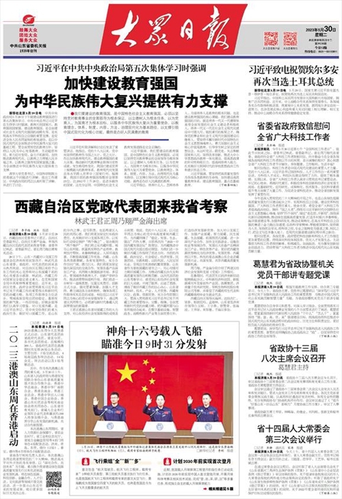 今年是深入贯彻党的二十大精神的开局之年,也是山东绿色低碳高质量发展先行区建设起步之年。实现科技自立自强、建设世界科技强国,广大科技工作者责任重大、使命光荣。希望全省广大科技工作者提高政治站位,胸怀“国之大者”,持续用习近平新时代中国特色社会主义思想凝心铸魂。坚持“四个面向”,锚定“走在前、开新局”,围绕深化新旧动能转换、推动绿色低碳高质量发展、打造乡村振兴齐鲁样板、海洋强省建设等,加强科研攻关,推动成果转化,在高水平科技自立自强的赛道上奋力跑出加速度。弘扬科学家精神,厚植爱国情怀,坚持敢为人先,发扬优良学风,将科学之技、专业之能转变为强省之策、利民之行,把论文写在齐鲁大地上,在现代化强省建设新征程中再立新功。