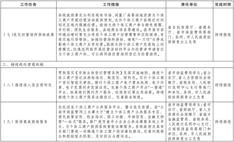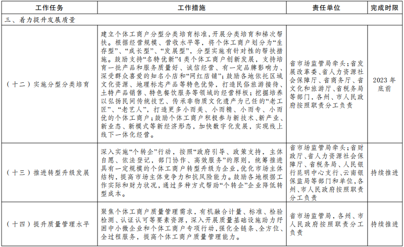 (十一)提供集成高效服务。依托国家个体工商户公共服务平台,整合优化资源,在“云南市场监管网上办事大厅”建立个体工商户公共服务专区,强化政策宣传、创业培训、招工对接、市场信息、金融支持等“一站式”服务。推广使用省中小企业公共法律服务线上平台,为个体工商户提供在线智能法律服务。各级政府及其有关部门要进一步畅通个体工商户投诉维权路径,完善问题转办和跟踪督办机制,及时回应合理诉求。