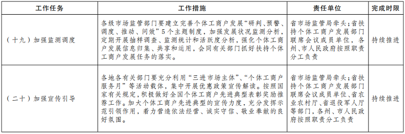 (二十一)加强监测调度。各级市场监管部门要建立完善个体工商户发展“研判、预警、调度、推动、问效”5个主题制度,加强发展状况监测分析,定期开展抽样调查、监测统计和活跃度分析,强化个体工商户发展信息归集、共享和运用,会同有关部门抓好扶持个体工商户发展任务的落实。