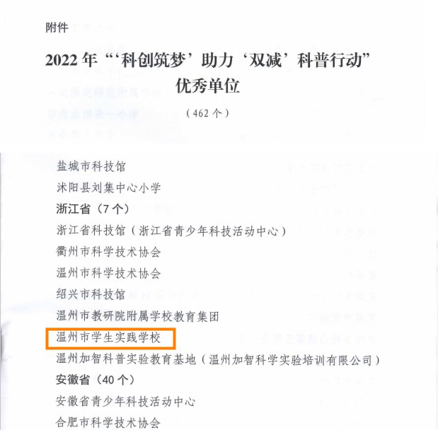 喜报!温实践校获评2022年“‘科创筑梦’助力‘双减’科普行动”全国优秀单位