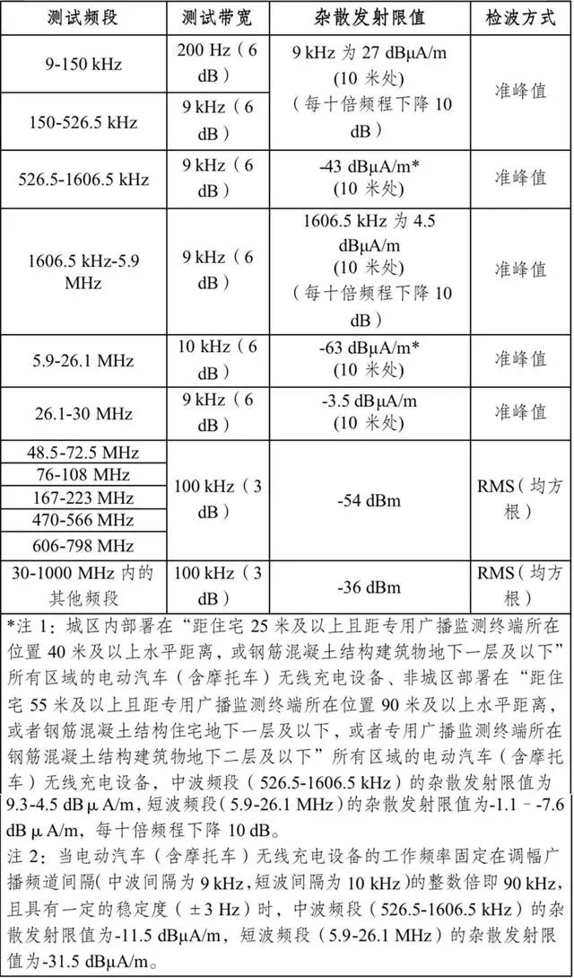 2.电动汽车(含摩托车)无线充电设备,杂散发射限值需满足下表: