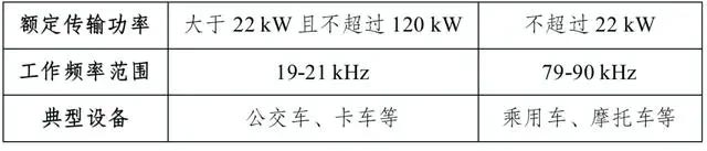 第五条 额定传输功率大于22kW但不超过120kW的电动汽车(含摩托车)无线充电设备工作频率为19-21kHz频段;额定传输功率不超过22kW的电动汽车(含摩托车)无线充电设备工作频率为79-90kHz频段。上述电动汽车(含摩托车)无线充电设备的工作频率等相关技术参数应当满足《无线充电(电力传输)设备技术要求》(见附件1)。