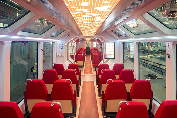 胡胡伊新能源轻轨列车项目于2022年5月签约,同年10月在中车唐山公司开工。列车优美的外观线条和配色,以乌马瓦卡山谷为主要特征,与当地自然地貌融为一体,并采用独特的广角观景窗设计,为游客乘车观光提供了极大的便利。列车还充分利用当地丰富的太阳能光伏发电,首次采用磷酸铁锂电池为列车驱动提供动力来源。同时,列车拥有智能人脸识别解锁、空调远程温度调节、智慧人机交互终端等智能化的人文感知系统,乘客通过智慧人机交互终端和动态地图,可随时查询线路、时刻表、站台导图、车厢布局等信息。