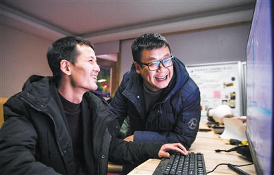 国家天文台阿里观测站驻站工程师尤显龙(左)和同事唐鹏在讨论观测到的数据。