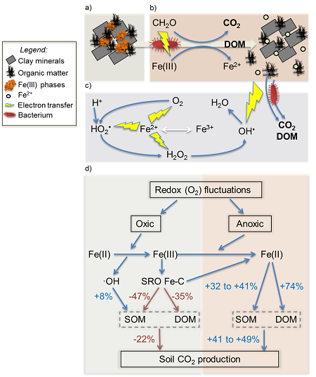 土壤有机碳库是全球碳循环的重要组成部分。土壤矿物与有机碳的相互作用对土壤有机碳稳定储存至关重要,其中铁氧化物的作用尤为关键。铁在土壤中具有三大重要功能:(1)铁氧化物可作为胶结剂促进土壤微团聚体的形成,从而形成对有机碳的物理保护;(2)铁氧化物可通过吸附和共沉淀作用与土壤有机碳结合形成复合体,从而降低有机碳的生物有效性、提高有机碳的稳定性以促进有机碳在土壤中的累积;(3)铁是土壤中重要的电子受体或供体:厌氧条件,铁氧化物易被微生物作为电子受体利用而被还原溶解产生Fe(II);铁还原的微生物代谢过程不仅直接耦合有机碳矿化,还导致与其结合的有机碳被释放到溶液中,提高微生物可利用性;铁还原过程产生的Fe(II)可以在氧气或硝酸盐的存在下被非生物氧化,或通过铁氧化细菌的新陈代谢被氧化;Fe(II)氧化可通过类芬顿反应(Fenton-like reaction)产生活性氧,进一步促进有机碳的分解。然而,这三大功能对土壤有机碳循环的相对贡献尚未可知,因此铁循环对土壤有机碳稳定存储的综合影响亟待评估。