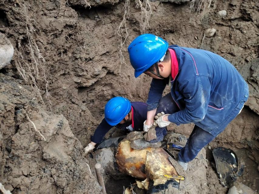 工作人员正在对腐蚀严重的一次供暖管进行切割。