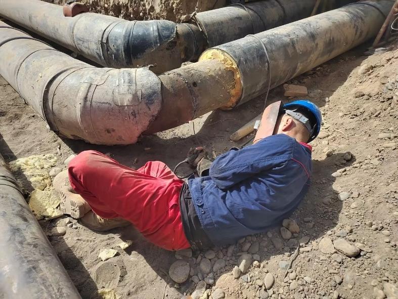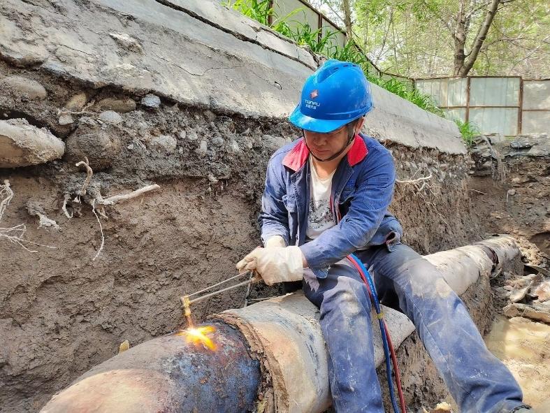 小区一次供暖管网年久腐蚀需要及时更换,工作人员正在进行焊接工作。