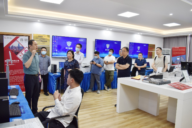 第二站为浙江金网信息产业股份有限公司信创适配实验室,讲解员对金网涉及的信息技术、行业领域及相关平台进行展示,并着重介绍了健康医疗相关领域的技术研发,郭辉进行了补充解说。会员嘉宾观看并了解了金网区块链+医疗平台、智慧OA、防疫一体机、海数控、“无接触”健康检测系统、“天烛”防疫平台几大医疗相关应用场景的研发成果,对金网的研发成果高度赞赏。