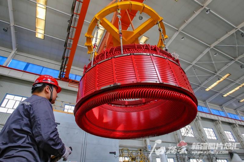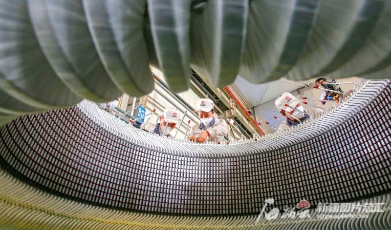 6月13日,工人在哈密中车新能源电机有限公司风电机组生产车间装配风机。