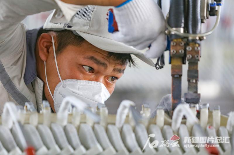 6月13日,工人在哈密中车新能源电机有限公司风电机组生产车间焊接风机组件。