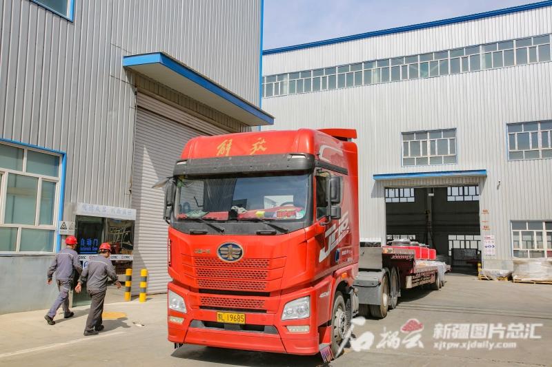 6月13日,运输车辆在哈密中车新能源电机有限公司准备运输风机。