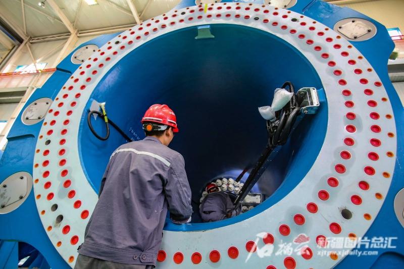6月13日,工人在哈密中车新能源电机有限公司风电机组生产车间检测风机部件。