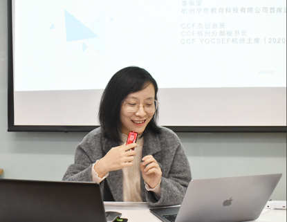 在专题报告环节,活动特邀嘉宾CCF杭州分部秘书长、杭州华恩科技有限公司创始人兼COO李怡雯分享了《高中信息技术新课标背景下,如何推广少儿编程教育》。她首先介绍了新课标提出后各学科的相关情况,其次针对信息技术新课标中教材修订的演变和学习对象的变化进行了梳理,并对此背景下推行的新教材进行了相关介绍。最后创造性地总结了在新形式下借力的几个方向。在报告期间,李怡雯与参会人员积极互动,并就浙江省高考制度中学考和选考部分的知识点要求、信奥赛基础对于高中信息技术课程的作用等方面进行了深入的交流与探讨。现场气氛活跃,参会者们积极提问,思维碰撞久久不散。