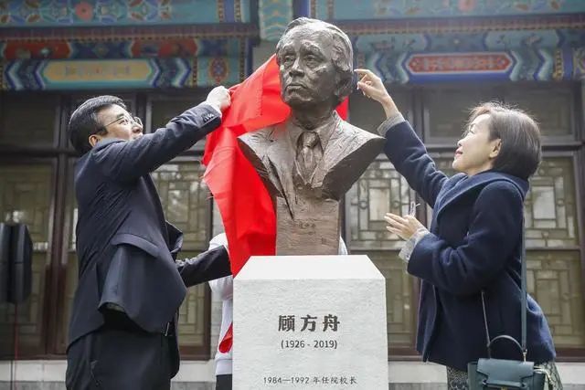 2021年10月29日,中国工程院副院长、中国医学科学院北京协和医学院院校长王辰(前左),顾方舟之女顾晓曼共同为顾方舟院校长雕像揭幕。新华社记者 张玉薇 摄
