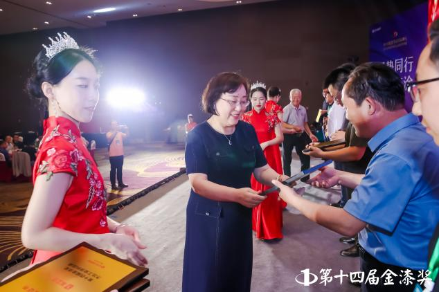 吴晓明秘书长向获得第十四届金漆奖“杰出工业涂料品牌”和“杰出涂料经销商”颁奖