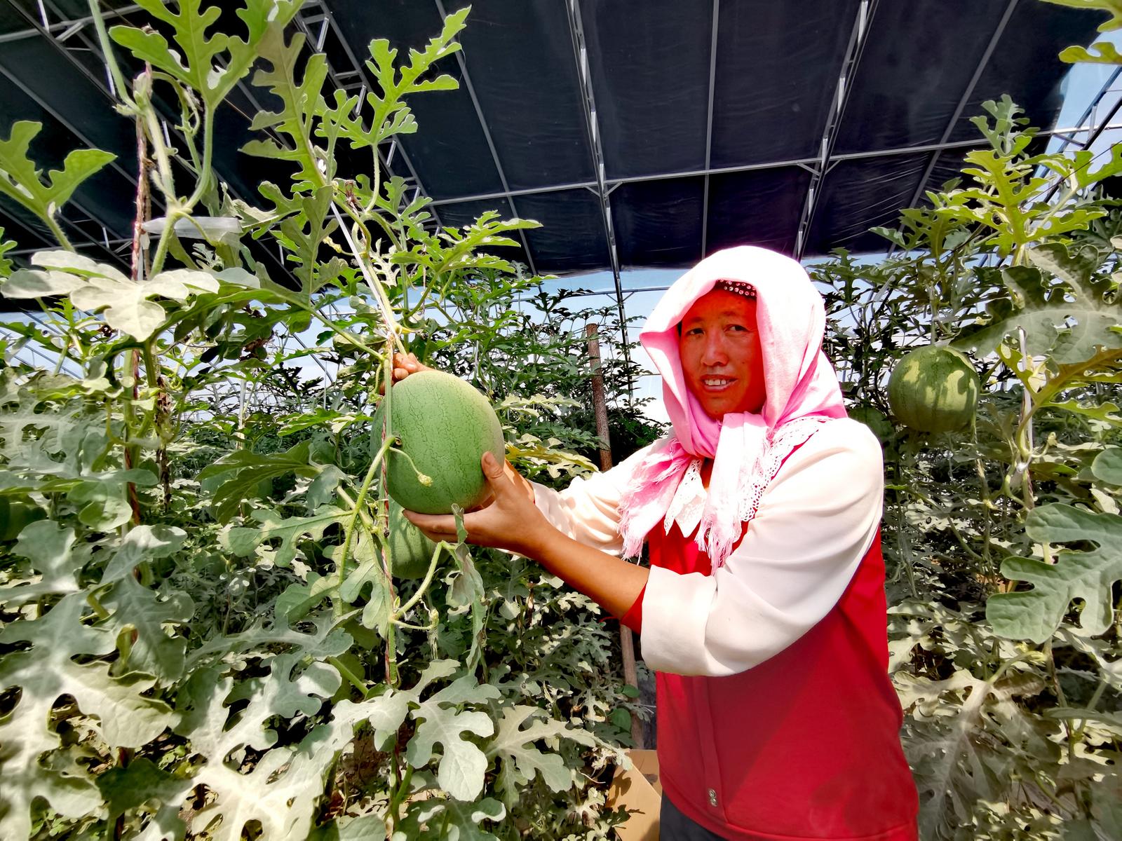 村民马凤梅正在自家承包的大棚里摘吊瓜。