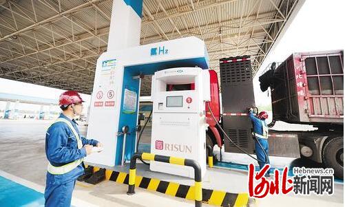 近日,定州旭阳氢能有限公司氢电油气综合能源站工作人员在为氢能重卡加氢气。 河北日报记者赵永辉摄