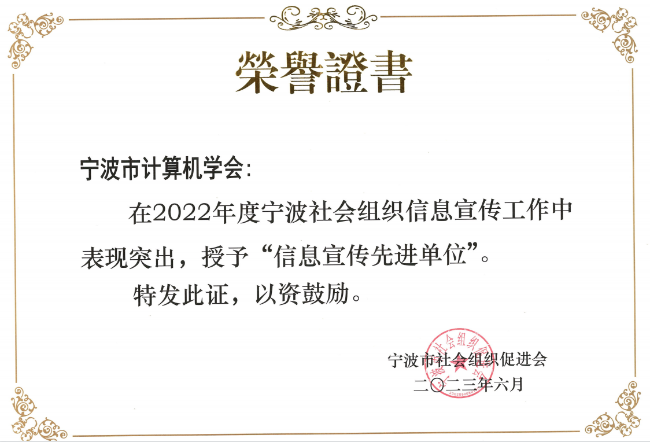 宁波市计算机学会获评“2022年度社会组织信息宣传先进单位”称号